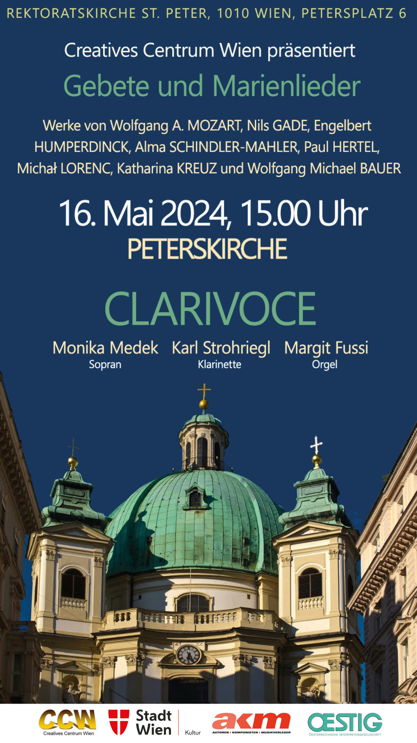Selten aber doch musizieren wir in mit Sopran – Klarinette – Orgel, wie in der schönen Wiener Peterskirche Mitte Mai, wo wir einen Reigen an Zeitgenoss*innen präsentieren, die zu den Themen Gebet, Marienlieder oder Tod Melodien ersonnen haben. Eine gute halbe Stunden Musik, wir freuen uns darauf!