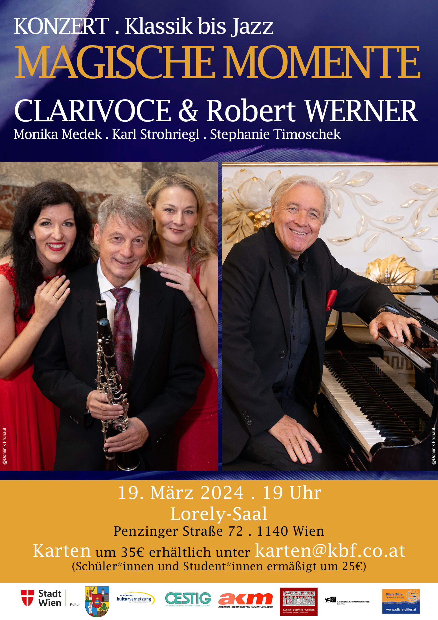 CLARIVOCE „Magische Momente“ CLARIVOCE und Robert Werner konzertieren erstmals gemeinsam! Am 19. März spielen wir im Lorely-Saal unser Programm MAGISCHE MOMENTE mit einigen Uraufführungen und spannen den Bogen von Klassik bis zu Jazz!